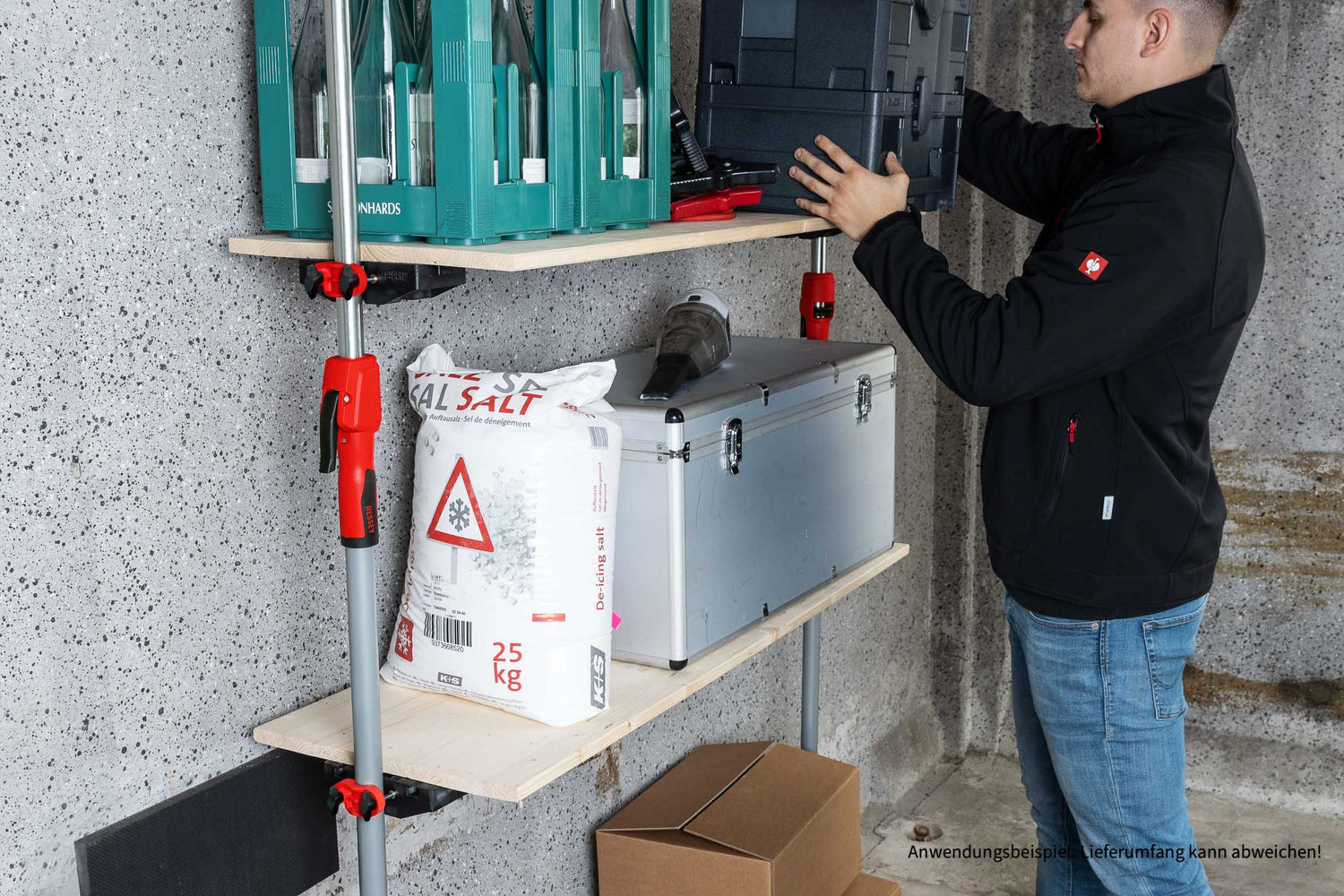 Halterung zum temporären Aufbau von Stellwänden und Ablageflächen, wie z.B. Tischen, Regalböden