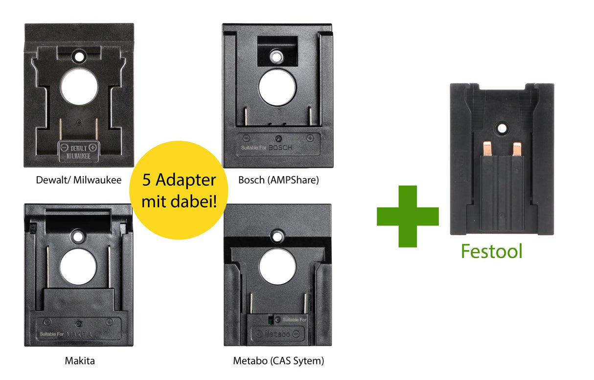 - Beim Betrieb mit 18V Akkus hast du alle wichtigen Akku-Adapter mit dabei! (Bosch, AMPShare, Makita, Dewalt, Millwaukee, Festool, Metabo, CAS System!)