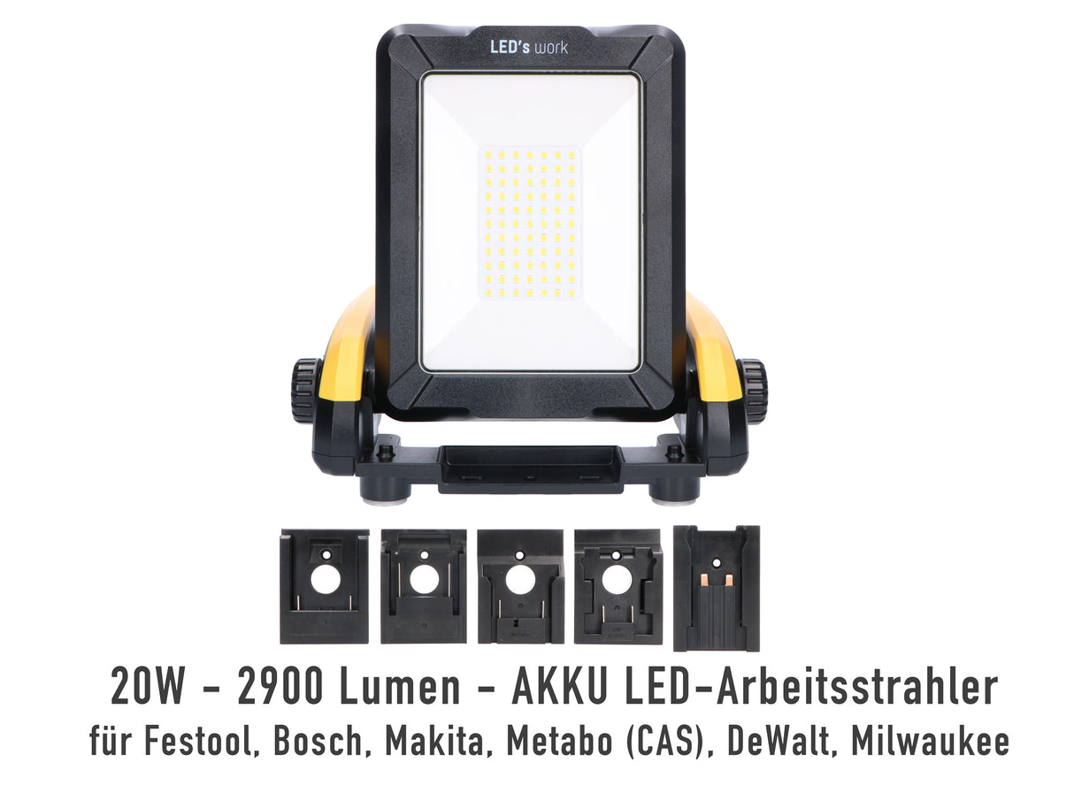 Diese vielseitige Arbeitsleuchte ist speziell für professionelle Handwerker, Mechaniker und Bauarbeiter konzipiert, die viel unterwegs sind. Sie ist mit einer Akkuhalterung ausgestattet, die durch eine Adaptertechnologie geeignet ist für 18-V-Akkus von Festool, Makita, Dewalt, Milwaukee, Bosch, Metabo (CAS).