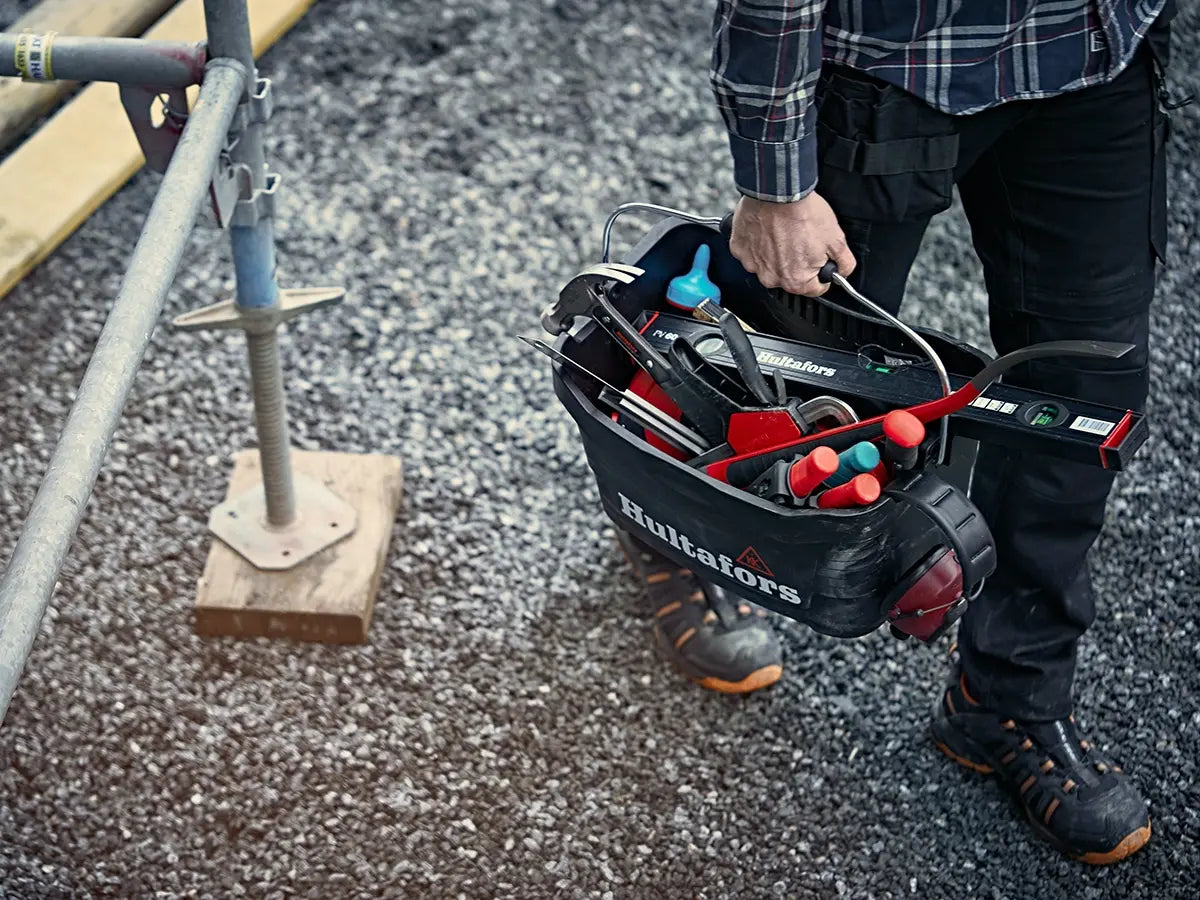 Werkzeugaufbewahrung muss nicht kompliziert sein. Ein wahrer Begleiter kann beispielsweise ein ergonomisch angepasster Werkzeugeimer aus schlagfestem Kunststoff von Hultafors sein. Erleichtern Sie sich das Mitführen von Werkzeugen, die für die aktuelle Arbeit benötigt werden.