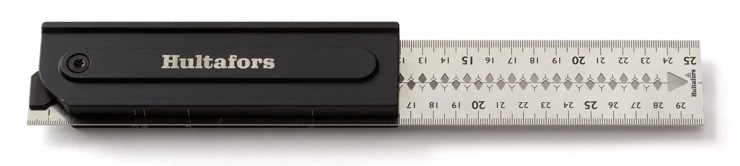 Patentierter Schreinerwinkel mit verstellbarer Schiene für 45°, 90°, 135° (180°, 225° und 270°) . Das Einrasten auf 270° auf der gegenüberliegenden Seite des Schenkels erleichtert das Anreißen an dünnen Materialien (z. B. Bleche), die auf der regulären Seite des Schenkels in die Schienenaussparung rutschen könnten. Zusätzlich gibt es Markierungen bei 22,5°, 67,5° und 75°/15°. Der Schreinerwinkel ist außerdem zusammenklappbar, wodurch er sich leicht verstauen und auch in der Hosentasche mitnehmen lässt. Die 45 mm breite Schiene ist auf das Arbeiten mit Standard-Balkenabmessungen ausgelegt und hat eine Mittelfräsung, die es einfach macht, die Balkenmitte anzureißen. Die Schiene hat Ausfräsungen im Abstand von 5 mm, welche dazu verwendet werden können, Linien parallel zu einer Kante anzureißen.