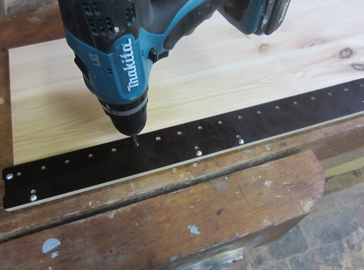 Mit Hilfe eines 5mm Bohrer oder eines Anschlagstifts kann eine Lochreihe theoretisch Endlos gebohrt werden, dafür muss die Bohrlehre nur umgespannt werden. Zusätzlich benötigen Sie noch eine Bohrmaschine, zwei kleine Schraubzwingen und einen 5mm Bohrer