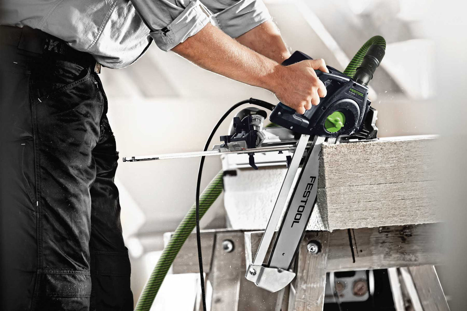 - Schnurgerade und ausrissfreie Schnitte dank Führungsschiene