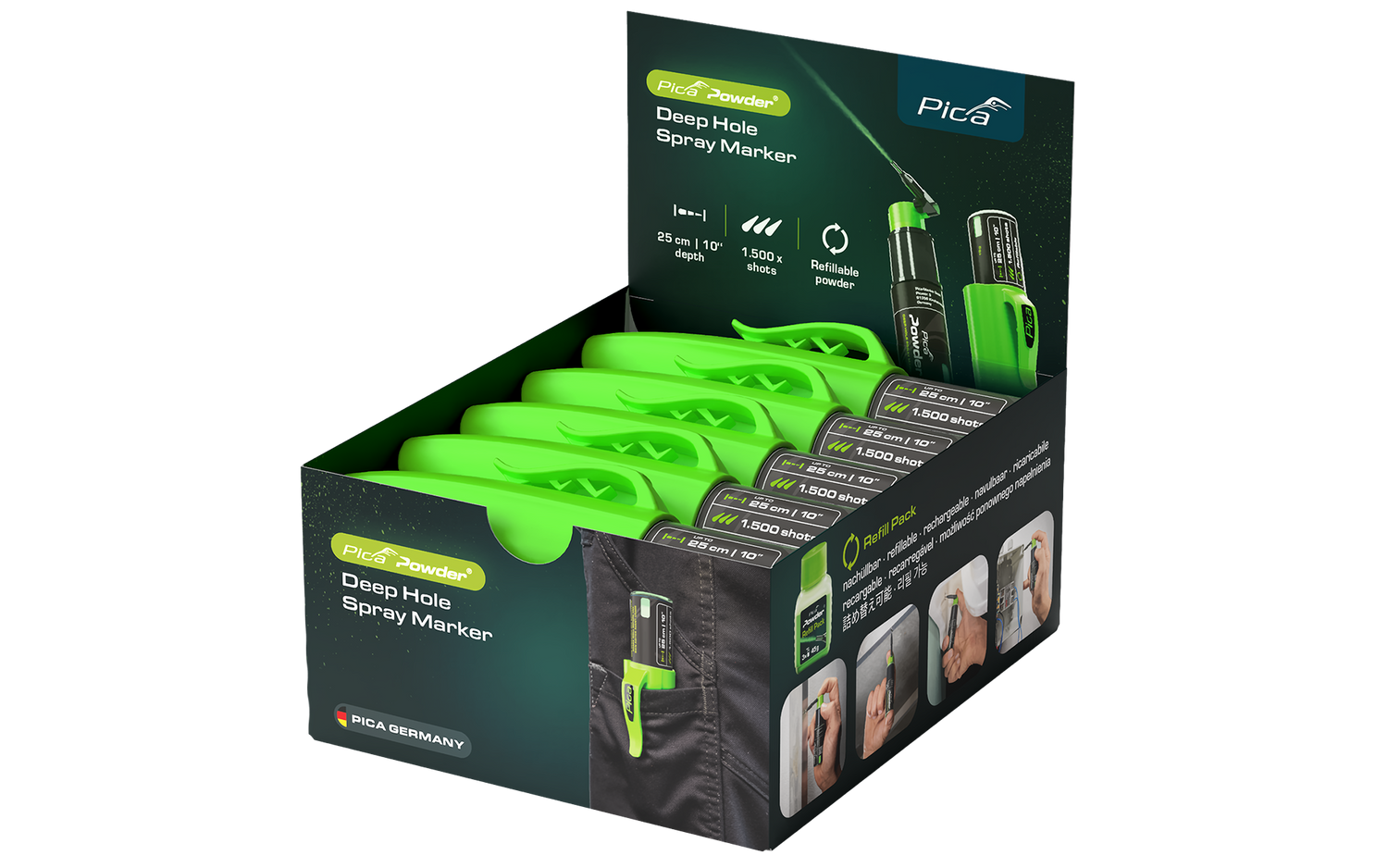 Der neue Pica Powder Spraymarker setzt Maßstäbe beim Markieren durch Bohrlöcher. Dank seines 360°-Sprüharms ermöglicht er präzise Punktmarkierungen bis 25 cm Tiefe, selbst an schwer zugänglichen Stellen. Die grün-fluoreszierende Kreidefarbe sorgt für eine exakte und vollflächige Abbildung des Bohrlochs – auf trockenen, feuchten, glatten oder rauen Oberflächen. Mit bis zu 1.500 Markierungen pro Füllung, nachfüllbarem System sowie effektivem Staub- und Nässeschutz ist er das ideale Werkzeug für Holzbau, Elektro-, Sanitär- und Bauarbeiten. Leicht abwischbar auf glatten Flächen, spart er Zeit und liefert maximale Genauigkeit im Arbeitsalltag.