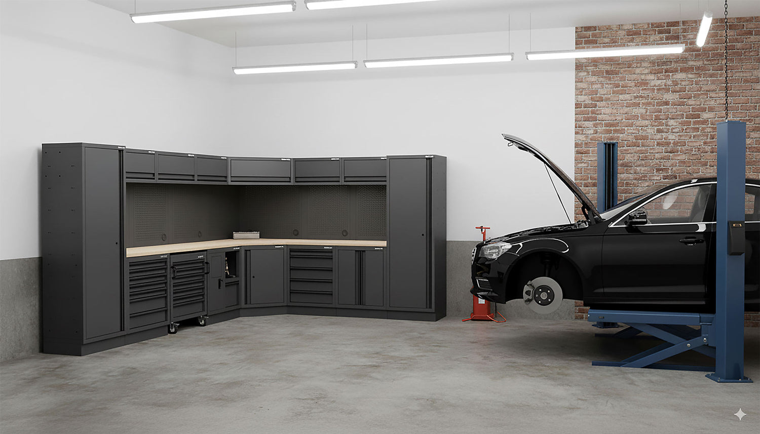 - Durchdachte Ausstattung mit Schubladenmodulen, Werkzeuglochplatten, Hängeschränken und vieles mehr...